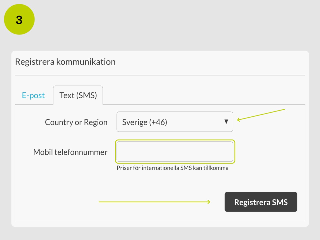 - Välj land och registrera ditt mobilnummer - inklusive första 0:an och utan bindestreck.