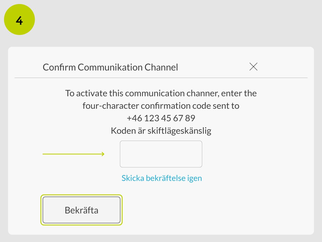 - När du sedan klickar på Registrera SMS skickas en kod till din mobil. Koden anger du i nästa steg som öppnas automatiskt, sedan klickar du på Bekräfta.