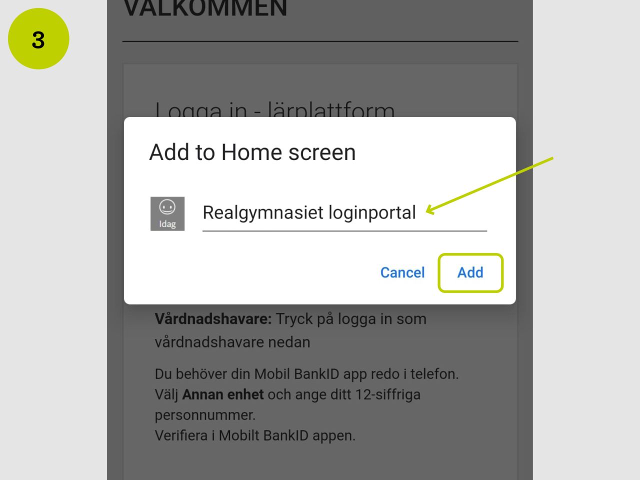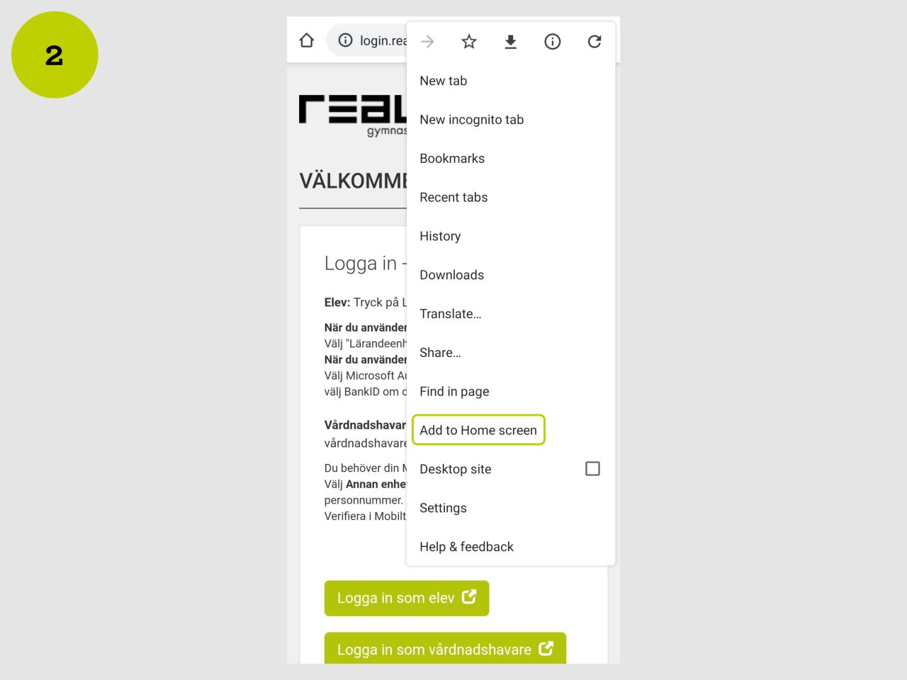 När sidan öppnar sig klickar du på tre prickar. - Klicka på Lägg till på startskärmen.